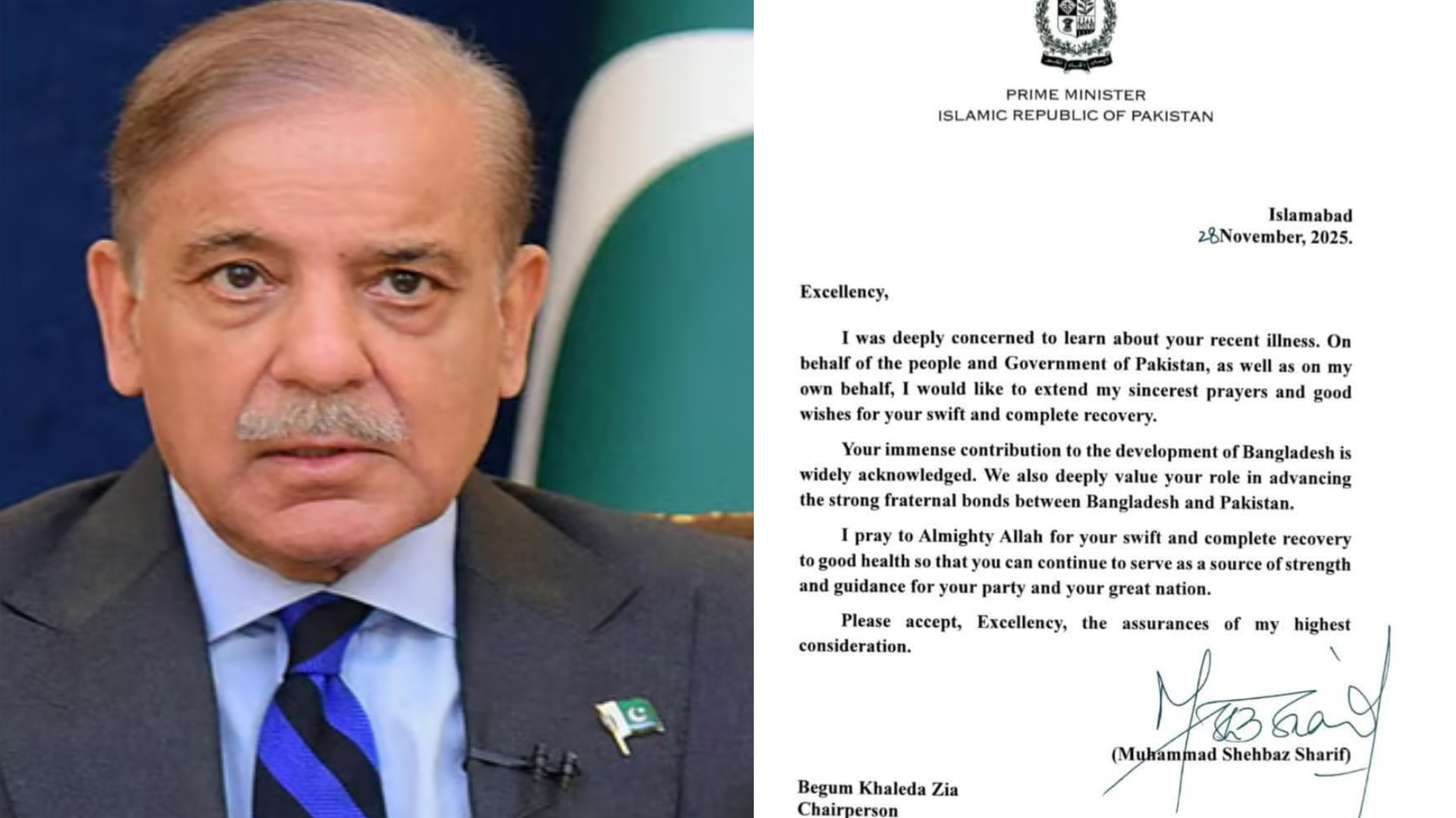 শনিবার রাতে বিএনপির অফিশিয়াল ফেসবুক পেজে প্রকাশিত এই চিঠিতে তিনি খালেদা জিয়ার সাম্প্রতিক শারীরিক জটিলতা নিয়ে গভীর উদ্বেগ প্রকাশ করেন এবং তাঁর পূর্ণ আরোগ্য কামনা করেন। দীর্ঘদিন ধরে হৃদ্‌রোগ, ডায়াবেটিস, আর্থ্রাইটিস, লিভার সিরোসিস ও কিডনির জটিলতায় ভুগছেন খালেদা জিয়া। গত রোববার শ্বাসকষ্ট দেখা দিলে তাঁকে দ্রুত রাজধানীর এভারকেয়ার হাসপাতালে ভর্তি করা হয় এবং বর্তমানে সিসিইউতে মেডিকেল বোর্ডের তত্ত্বাবধানে চিকিৎসাধীন আছেন। গত কয়েক দিনের তুলনায় তাঁর শারীরিক অবস্থার সামান্য উন্নতি হলেও কিডনির সমস্যা গুরুতরই রয়ে গেছে, যার কারণে তাঁকে টানা চার দিন ডায়ালাইসিস করানো হয়। শাহবাজ শরিফ চিঠিতে আরও জানান, বাংলাদেশের উন্নয়নে খালেদা জিয়ার ভূমিকা ও পাকিস্তান–বাংলাদেশ সম্পর্ক জোরদারে তাঁর অবদান অত্যন্ত মূল্যবান। তিনি আল্লাহর কাছে দোয়া করেন, খালেদা জিয়া যেন দ্রুত সুস্থ হয়ে দেশ ও দলের জন্য নেতৃত্ব দিতে পারেন।